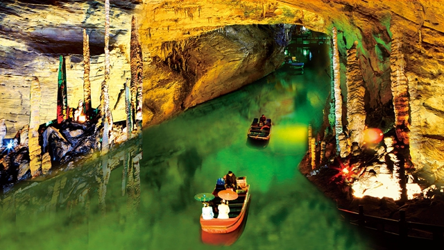 黃龍洞因相傳古代洞內有黃龍藏身而得名,1983年經當地8個青年民兵發(fā)現(xiàn)探明,1984 年正式對外開放。因洞內擁有高闊的洞天、幽深的暗河、懸空的瀑布、上千個白玉池、數萬根石筍。