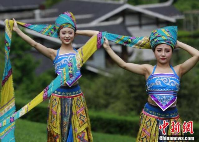 張家界武陵源上演苗族頭帕秀。